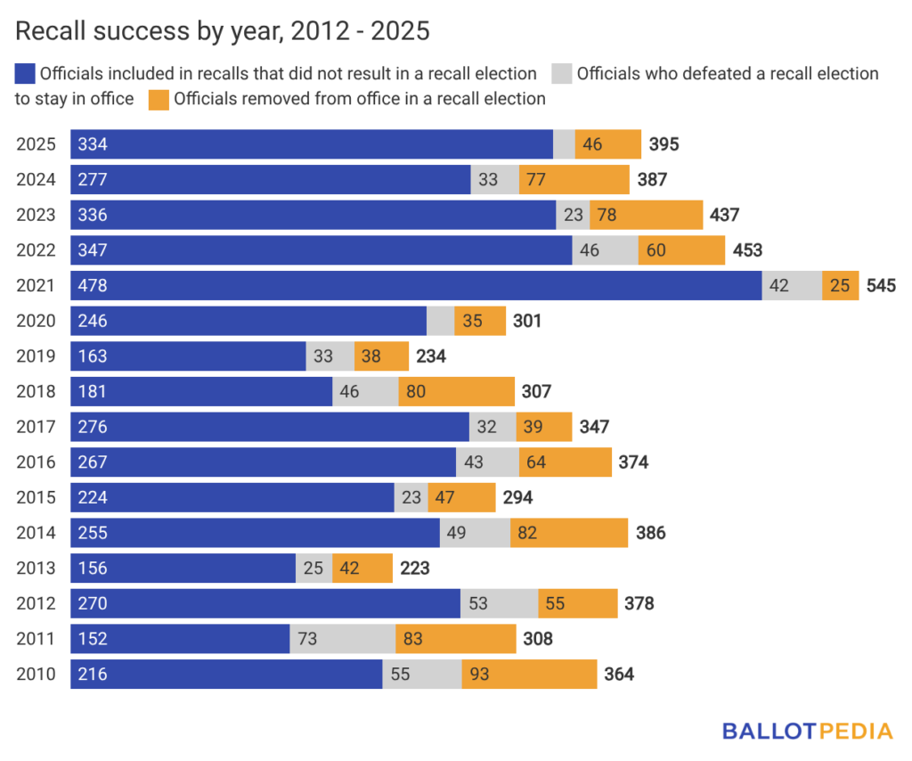 So far, voters have removed six of the 174 elected officials named in recall efforts this year. Of the two other elected officials who have faced recall efforts so far this year, voters did not recall one and results are still pending for the other official.