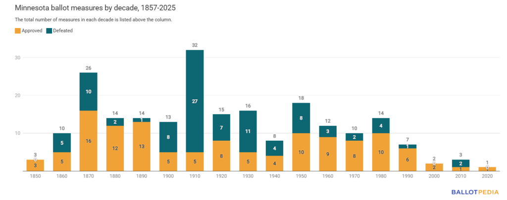 Ballotpedia completed an inventory of all Minnesota ballot measures dating back to 1857, the year Minnesota voters ratified the state constitution and the year before Minnesota was admitted to the union. Between 1857 and 2025, Minnesota voters decided on 218 ballot measures. In total, 123 measures were approved (56.4%), and 95 were defeated (43.6%).