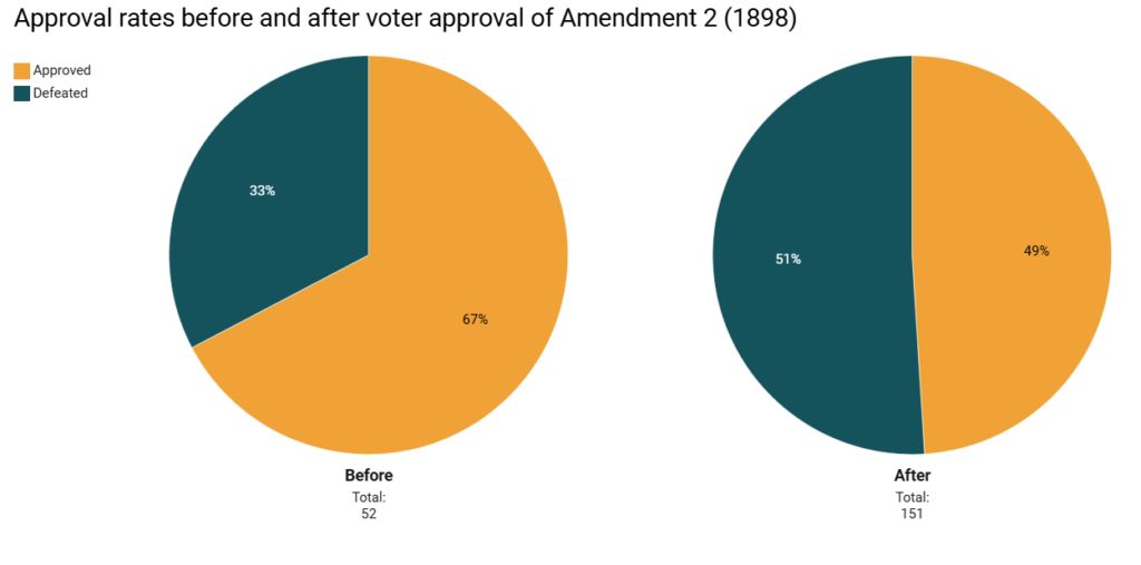 The chart below shows the percentage of amendments approved by voters before and after the supermajority requirement was instituted in 1898.