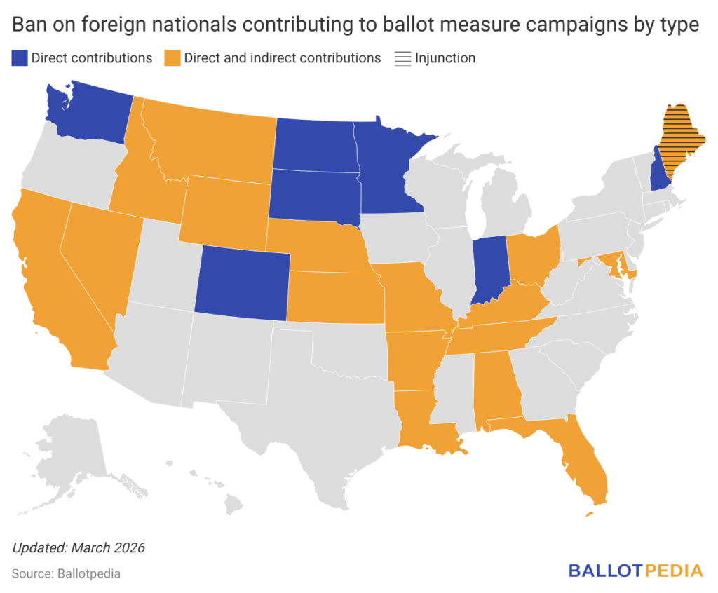 Alabama is the first state to pass such a ban this year. In 2025, nine states — Arkansas, Indiana, Kansas, Kentucky, Louisiana, Missouri, Montana, Tennessee, and Wyoming — enacted bills prohibiting foreign nationals from making contributions or expenditures to support or oppose ballot measures. California made changes to its existing law by adding foreign nationals to the list of banned foreign entities.