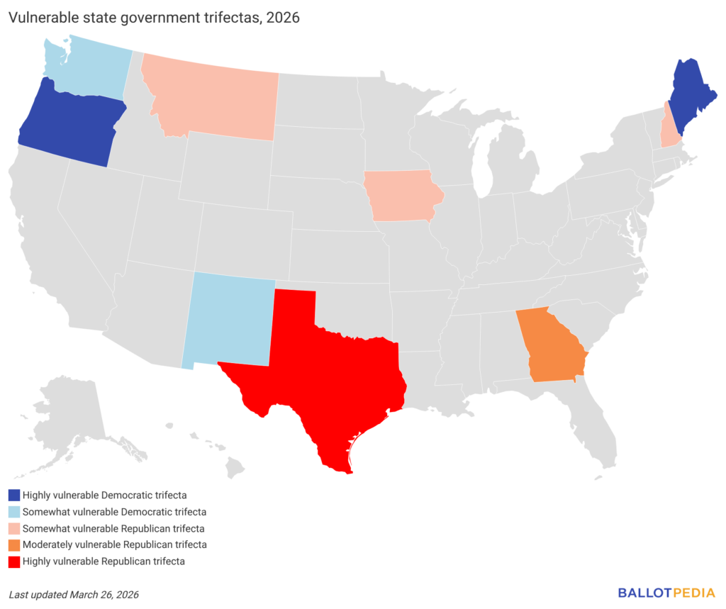 According to Ballotpedia's annual trifecta vulnerability ratings, nine state government trifectas are vulnerable in the 2026 elections. Democrats are defending four vulnerable trifectas and Republicans are defending five.