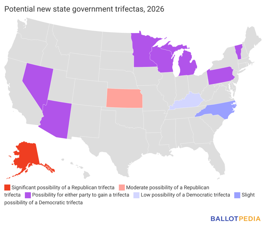 Ballotpedia also assessed the chances of new trifectas forming in states that are currently under divided government. Possible Democratic trifecta pickups are Kentucky and North Carolina, while possible Republican pickups are Alaska and Kansas. In Arizona, Michigan, Minnesota, Nevada, Pennsylvania, Vermont, and Wisconsin, either party could establish a state government trifecta.