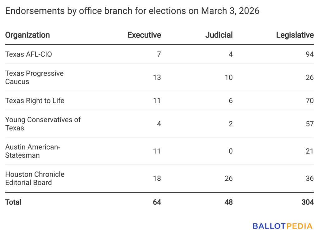 Endorsements are one of the ways voters learn who candidates are and what they stand for — especially in down-ballot races where little other information is available. Ballotpedia tracks endorsements from organizations we call Recognized Endorsement Contributors (RECs): groups ranging from labor unions and advocacy organizations to newspaper editorial boards that publicly support candidates and communicate those choices to voters. In Texas' March 3 primaries, we tracked 716 total endorsements, including 416 from six groups.