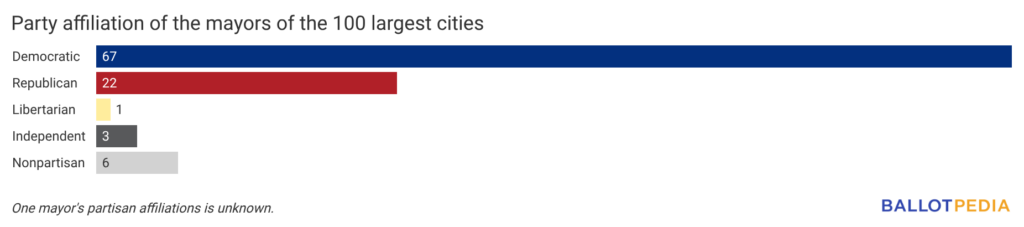 The following chart shows the partisan affiliations of all mayors among the top 100 most populous cities.