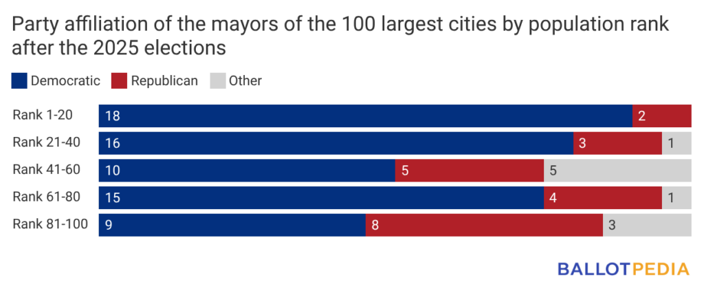 Based on 2020 population estimates, 81% of the population of the top 100 cities lived in cities with Democratic mayors, and 14% lived in cities with Republican mayors at the start of 2026.