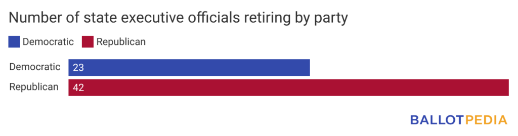 In total, 42 state executives announced their retirements in March. Nineteen of these officials are Democrats, and 23 are Republicans. This brings the total partisan balance of retiring incumbents in the 2026 election cycle to 23 Democratic officials and 42 Republicans.