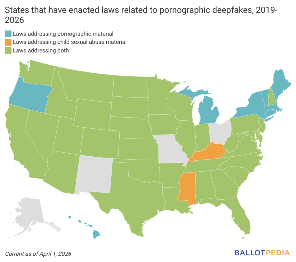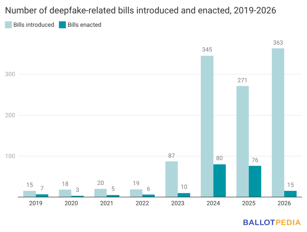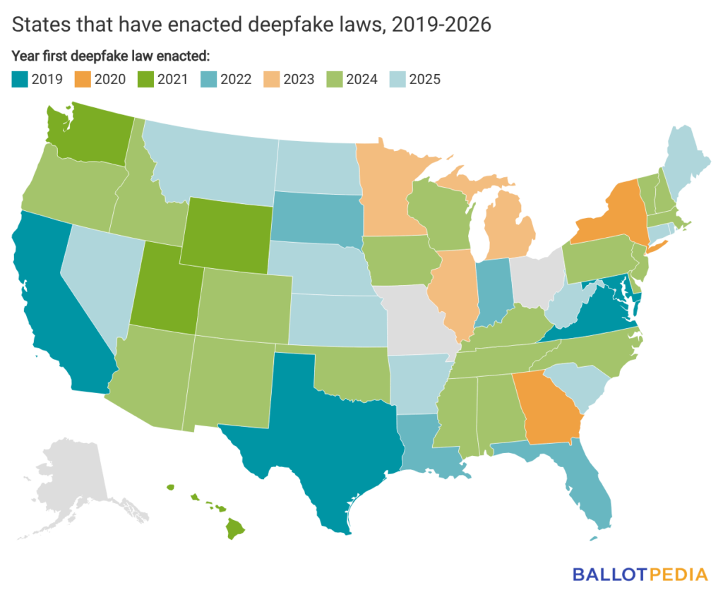 So far this year, state lawmakers have enacted 15 bills addressing deepfakes. Since 2019, 47 states have adopted laws that deal with deepfakes, with no change in that total since 2025. The three states without such laws are Alaska, Missouri, and Ohio.
