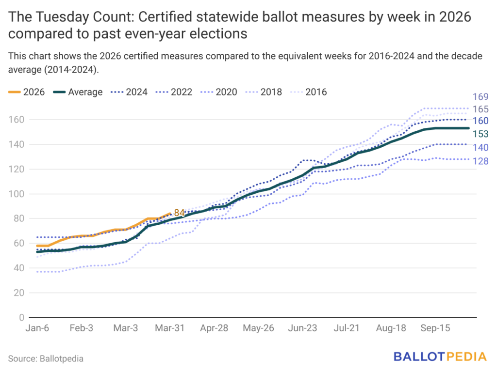As of March 31, the 84 statewide measures certified for statewide ballots this year are above the historical average for this point in the cycle across even-numbered years from 2014 through 2024.
