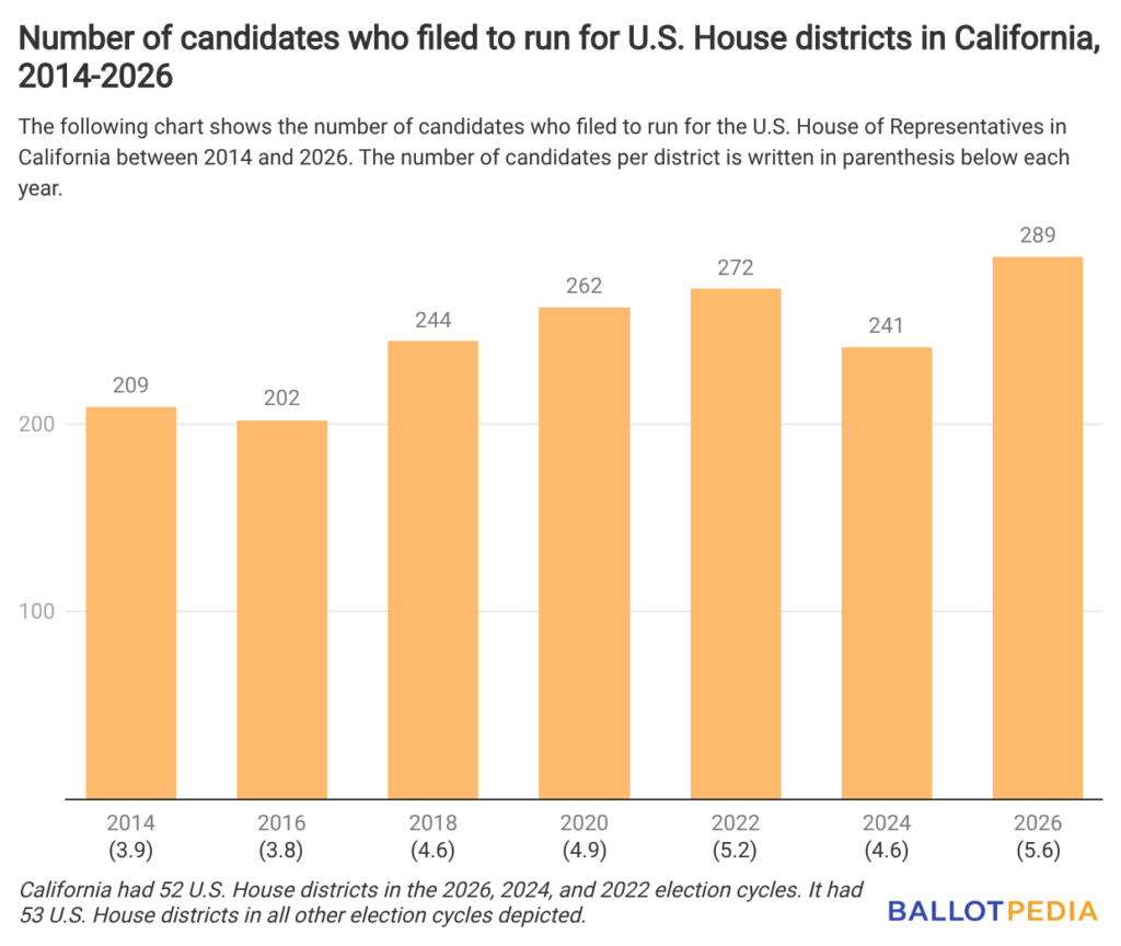 A record 289 candidates, 5.6 per district, are running for California's 52 congressional districts in the state’s June 2 top-two primaries. That’s the most candidates to run for the U.S. House since 2014 and the most candidates per district since 2022, when California was apportioned 52 districts following the 2020 census.
