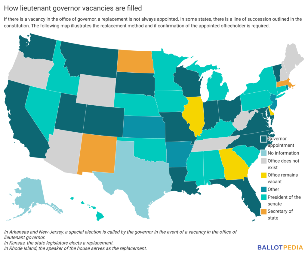 In 16 states, the governor appoints a replacement in the event of a lieutenant gubernatorial vacancy. In 15 states, the president of the state Senate makes the appointment, and in two states, the secretary of state makes the appointment.