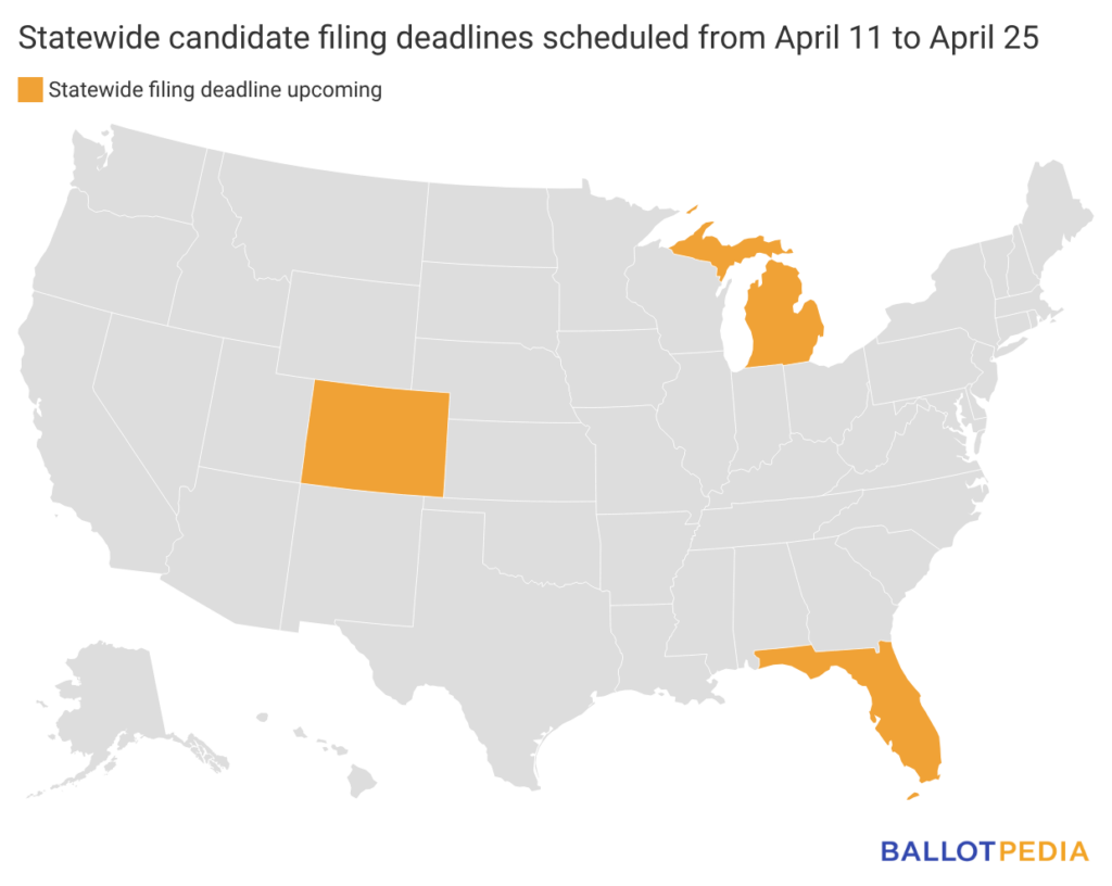 - Florida: April 24 (statewide candidate filing deadline for U.S. Senate and state supreme court)
