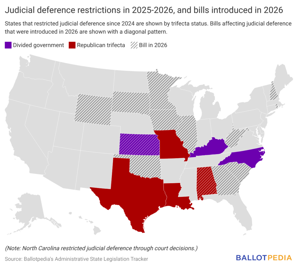 Ballotpedia has identified 23 bills in 13 states related to judicial deference in 2026, including the Alabama and Georgia bills.