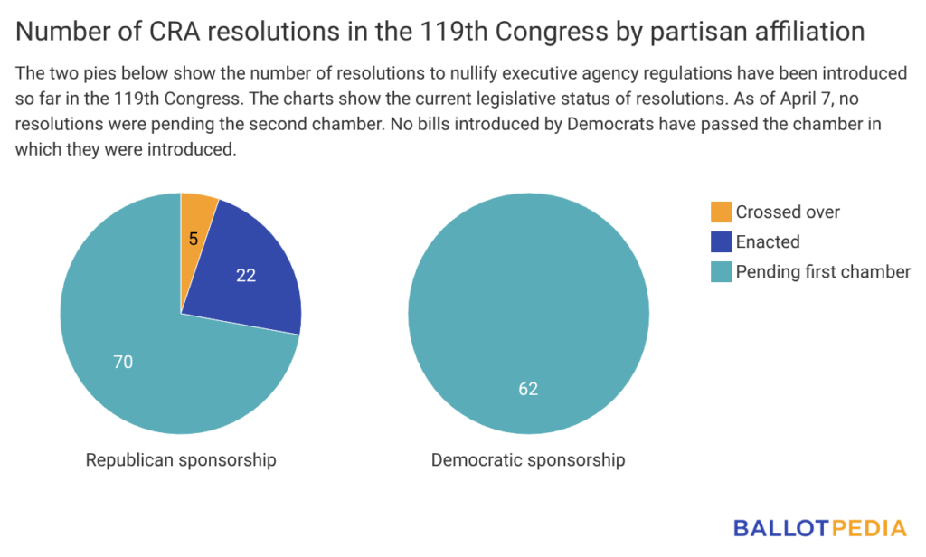 Of the 159 resolutions introduced under the CRA this session, Republicans have issued 97 (around 61%). However, Democrats have turned to the CRA in recent weeks, and, since the beginning of March, have introduced 40 of the 62 total resolutions introduced by Democrats this session. These resolutions are unlikely to be enacted, as they face two Republican-controlled chambers and need President Donald Trump's (R) approval. As of April 7, the U.S. Senate had rejected motions to proceed to the consideration of seven resolutions introduced by Democrats.