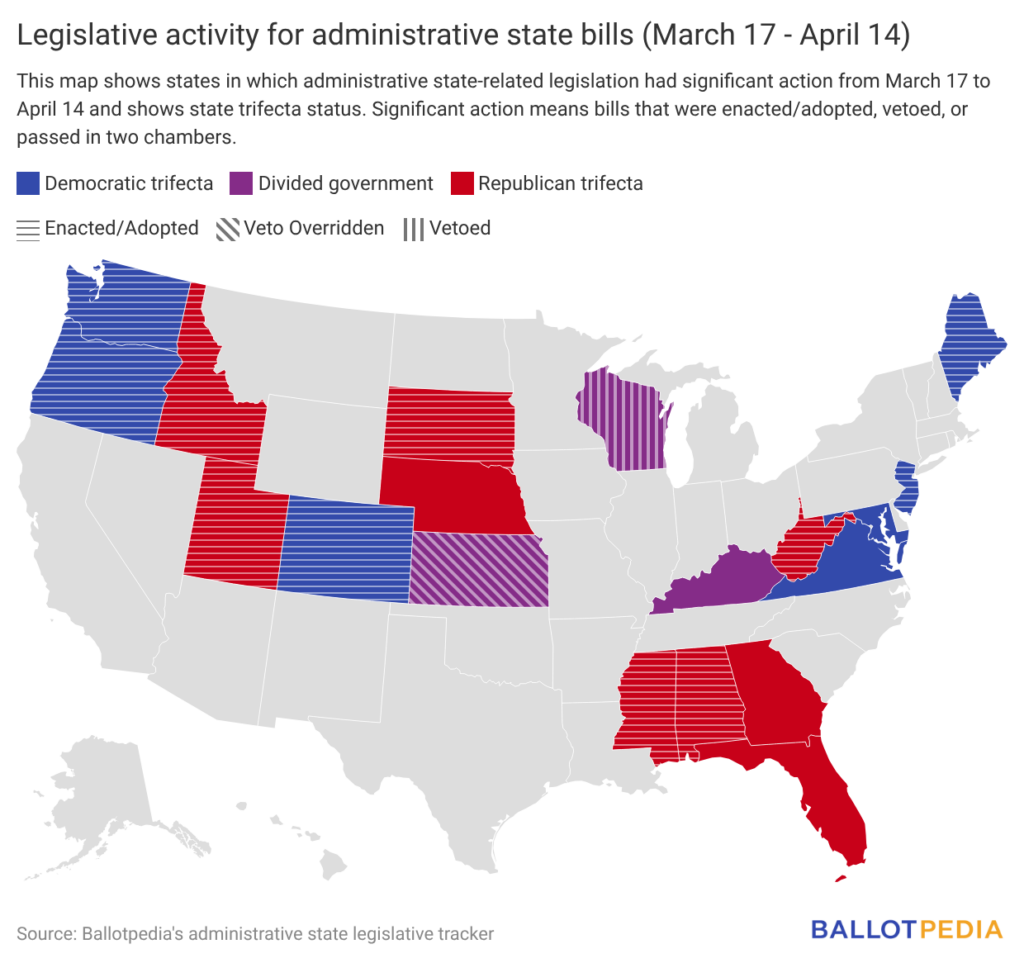 Since our last newsletter edition, Ballotpedia tracked significant legislative action (enactments, vetoes, and passage through both chambers) in 19 states on 109 bills related to the administrative state, as of April 14.