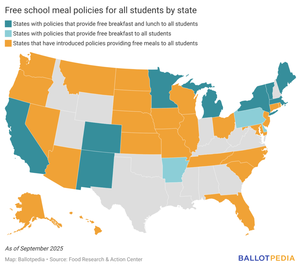 As of September 2025, nine states provide both a free breakfast and lunch to all students, while three states provide free breakfast to all students. California became the first state to implement a free meal policy (which took effect for the 2022-2023 school year). New York is the most recent state to implement a free meal policy, doing so for the 2025-2026 school year. Twenty-five other states and Washington, D.C., have introduced but not yet passed legislation that would provide free meals to all students.