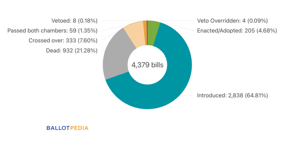 So far, 59% (120) of all enacted bills have been in states with Republican trifectas, while 34% (69) have been in states with Democratic trifectas and 8% (16) have been in states with divided governments.