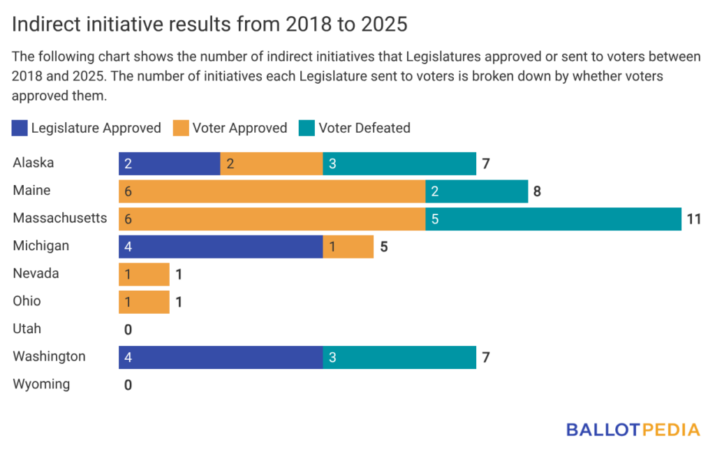 Between 2018 and 2025, the Maine Legislature sent all eight indirect initiatives that it received to voters, who approved six and defeated two.