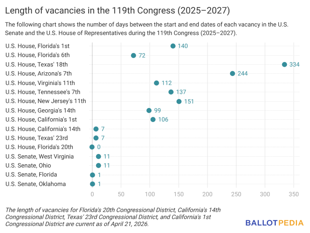 As of April 21, 2026, the vacancies in Florida's 20th Congressional District, California's 1st Congressional District, California's 14th Congressional District, and Texas' 23rd Congressional District have not been filled.
