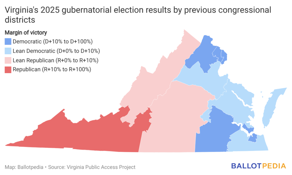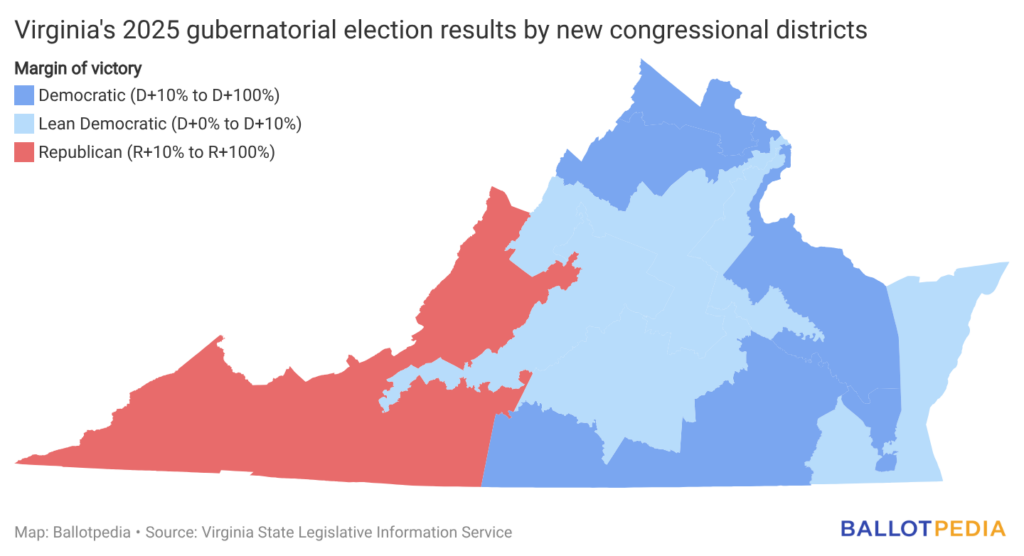 Virginia’s redrawn map shifts four districts with Republican representatives toward Democrats according to 2025 gubernatorial election results.