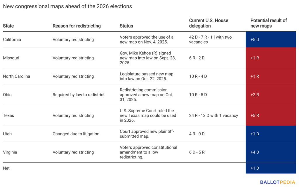 Virginia became the seventh state with new U.S. House district boundaries ahead of the 2026 elections when voters approved a constitutional amendment permitting mid-decade redistricting on April 21. Four other states—California, Missouri, North Carolina, and Texas—also adopted new maps voluntarily. Ohio was required by law to adopt a new map, and litigation led to a new map in Utah.