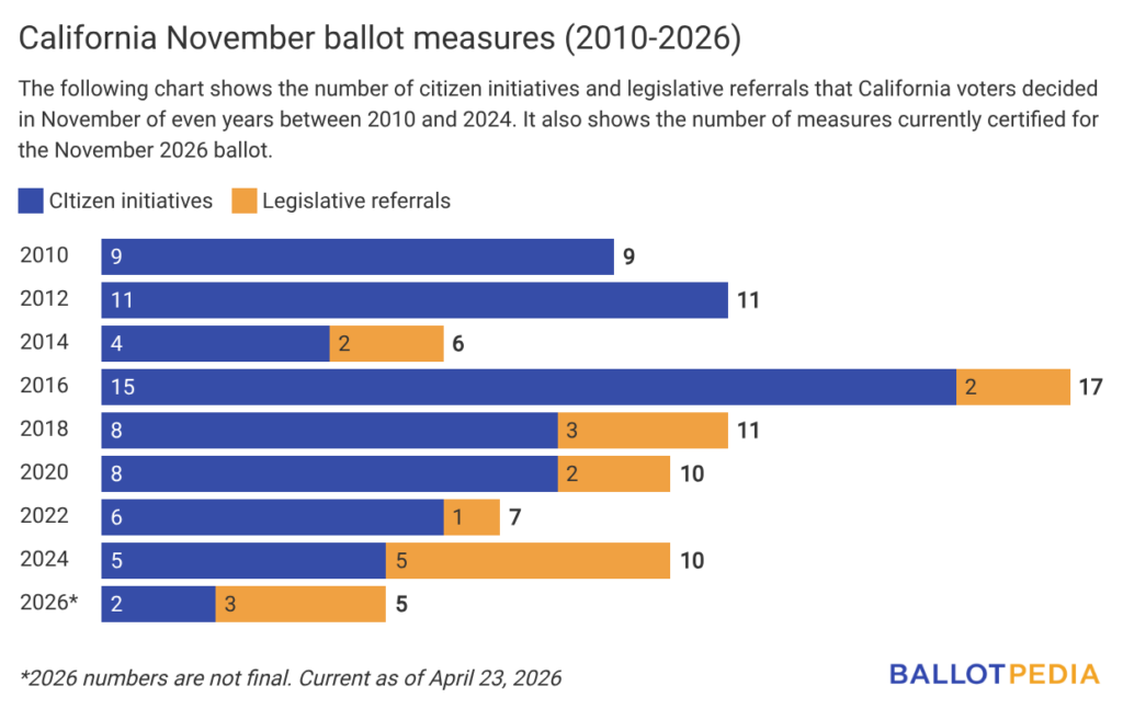 In even years between 2010 and 2024, California voters decided an average of approximately 10 ballot measures each November. Of these, an average of eight per year were citizen initiatives, and an average of two were legislative referrals.