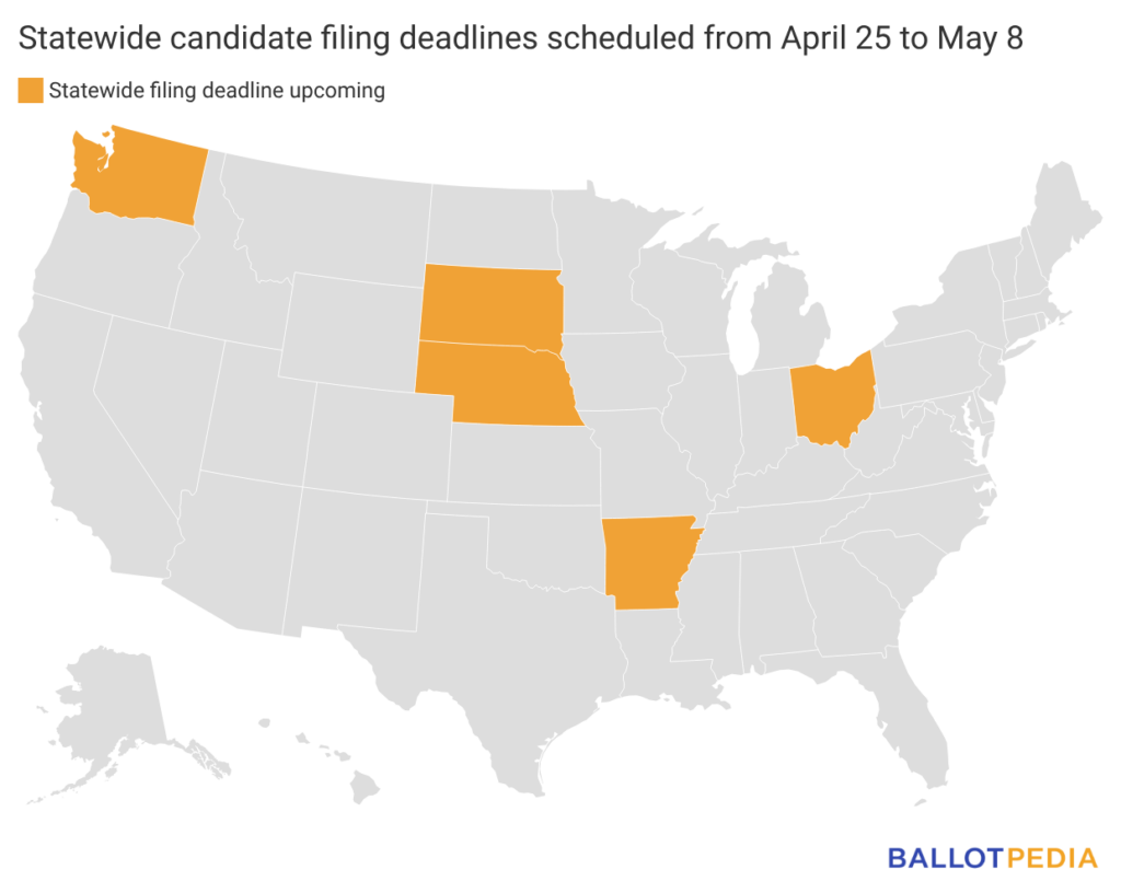 • South Dakota: April 28 (statewide unaffiliated candidate filing deadline)