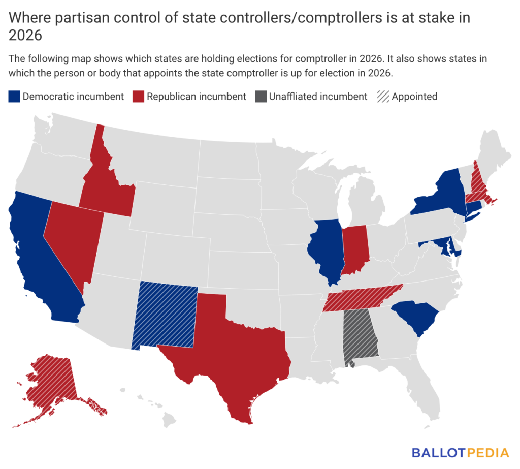 Heading into the 2026 elections, the partisan breakdown of all state financial officers was as follows:
