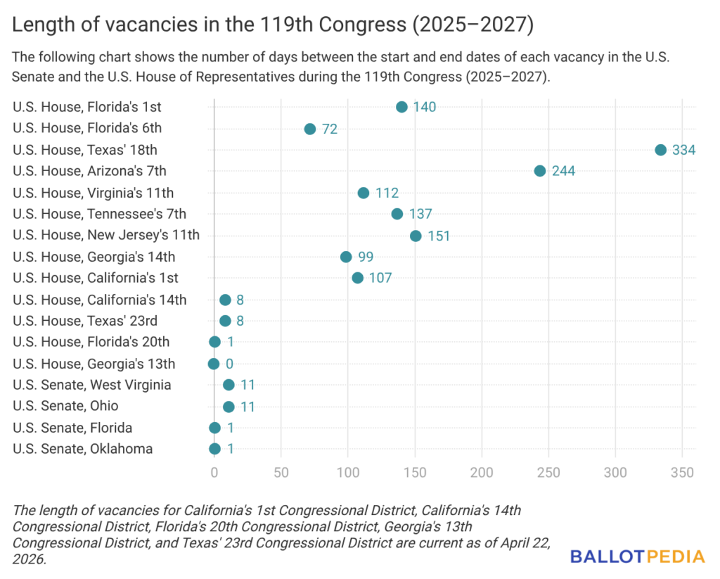 - Rep. Doug LaMalfa (R-Calif.) died on Jan. 5, 2026. As of April 22, 2026, California's 1st Congressional District has been vacant for 107 days.