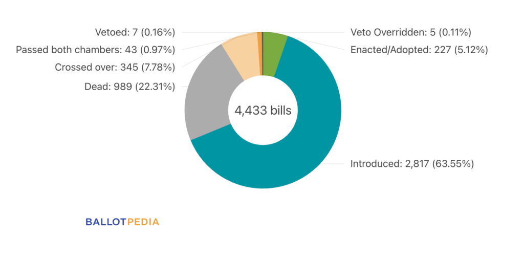 We are currently tracking 4,433 election-related bills across the country. The chart below breaks down the status of those bills by where they stand in the legislative process: