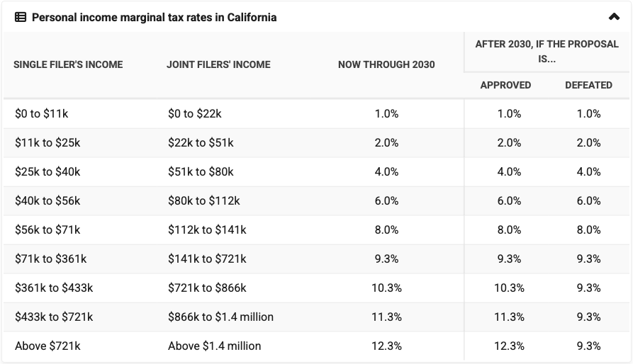 In California, the income tax bracket applies to a filer's portion of income within that bracket. The chart below shows the current rates through 2030 and the tax rates if it is approved or rejected.