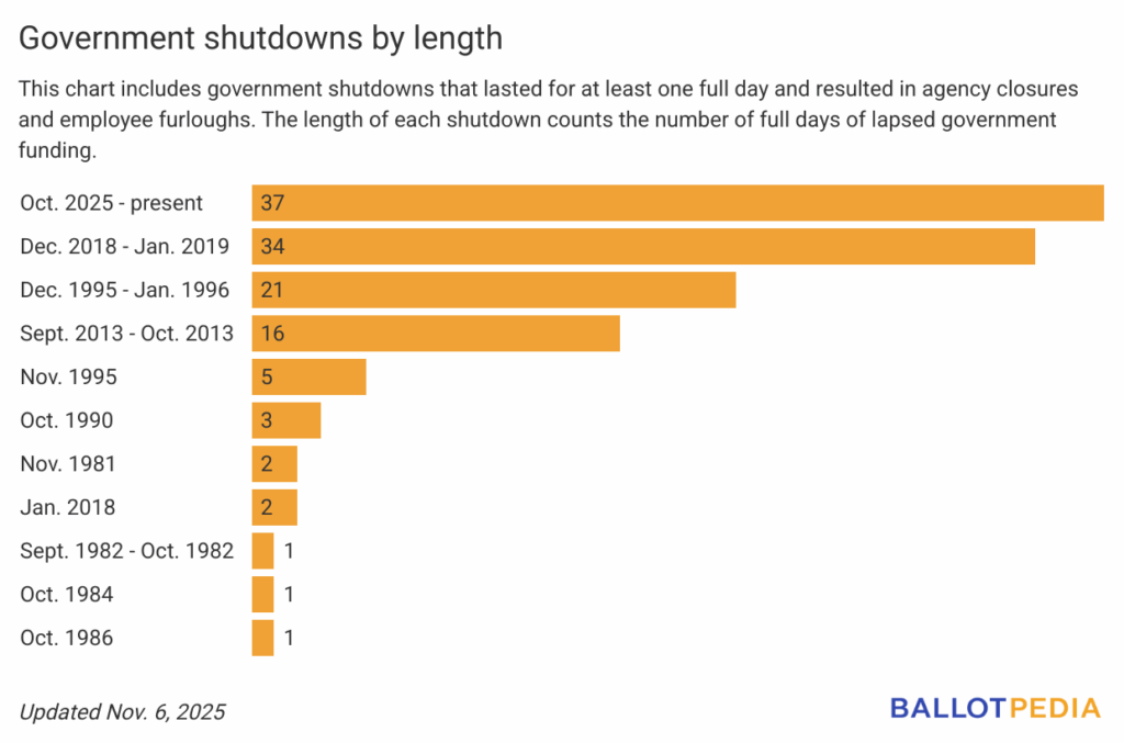 November 4th was the 35th day of the federal government shutdown making it the longest shutdown in U.S. history. It has outlasted the shutdown that ran from December 2018 to January 2019, which lasted 34 full days.