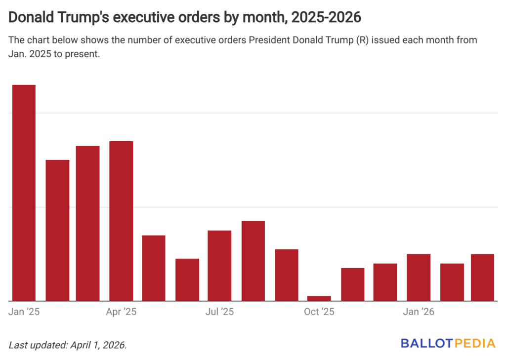 President Donald Trump (R) issued ten executive orders in March, bringing his total to 253 in his second term. This was the fifth-lowest monthly total of his second term thus far. Trump issued orders on housing, cybersecurity, and the administrative state. Click here to read more about each order.
